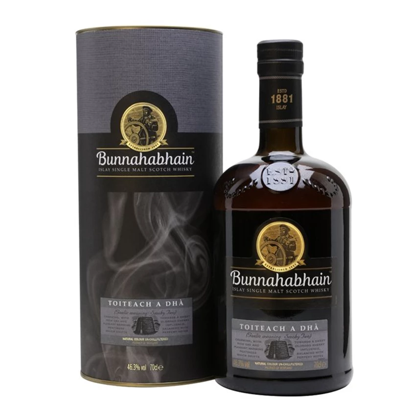 The first peated whisky in Bunnahabhain’s core range. Like the limited edition Toiteach that came before it, Toiteach A Dha (which means ‘smoky two’ in Scots Gaelic) is a smoky single malt with a sherry twist. Matured in both bourbon and sherry casks, with a higher sherry influence than Toiteach, this is a delicate mix of smoke and sweet sherry fruit.